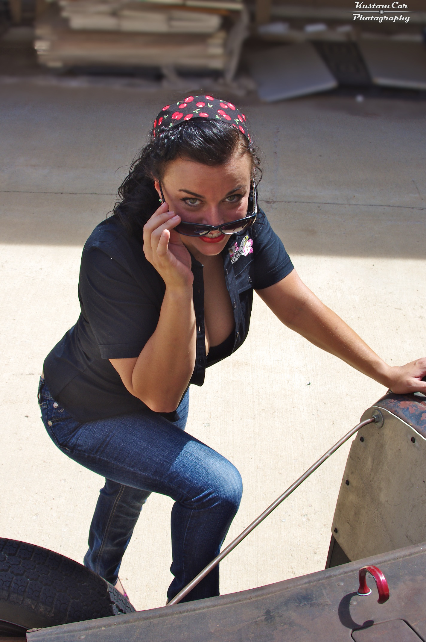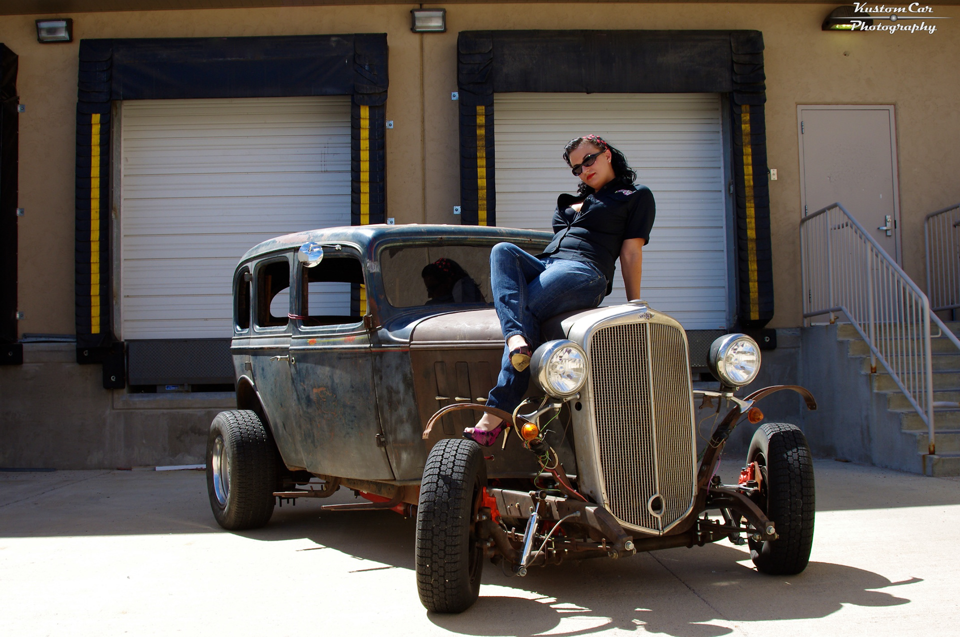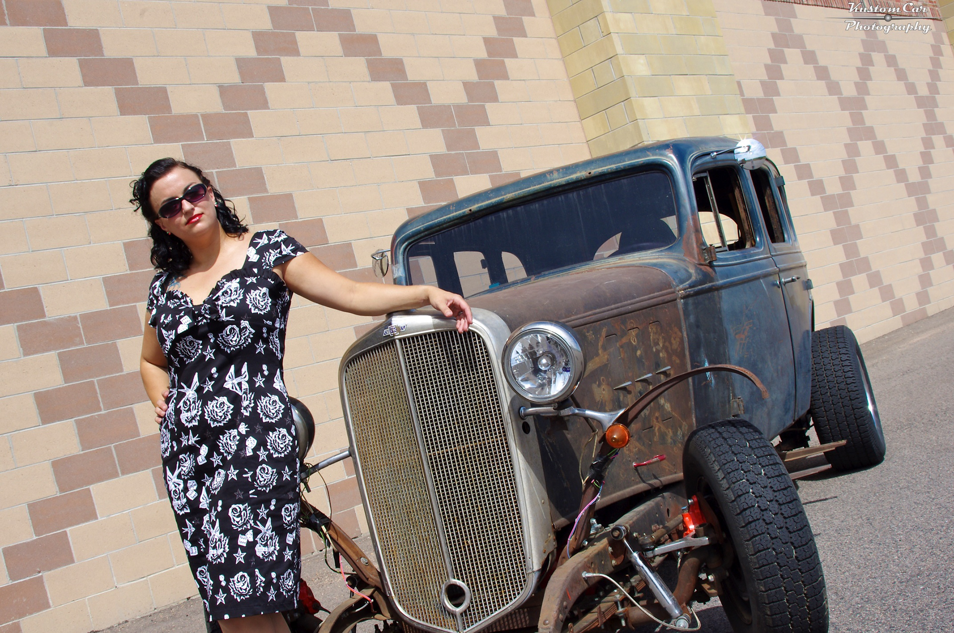Kustom car shoot with the beautiful Shannon. The car was provided by Ron, it is a rare 33 Chevy Delux. Body looks rough but the car is solid, a great "rat rod" and daily driver.